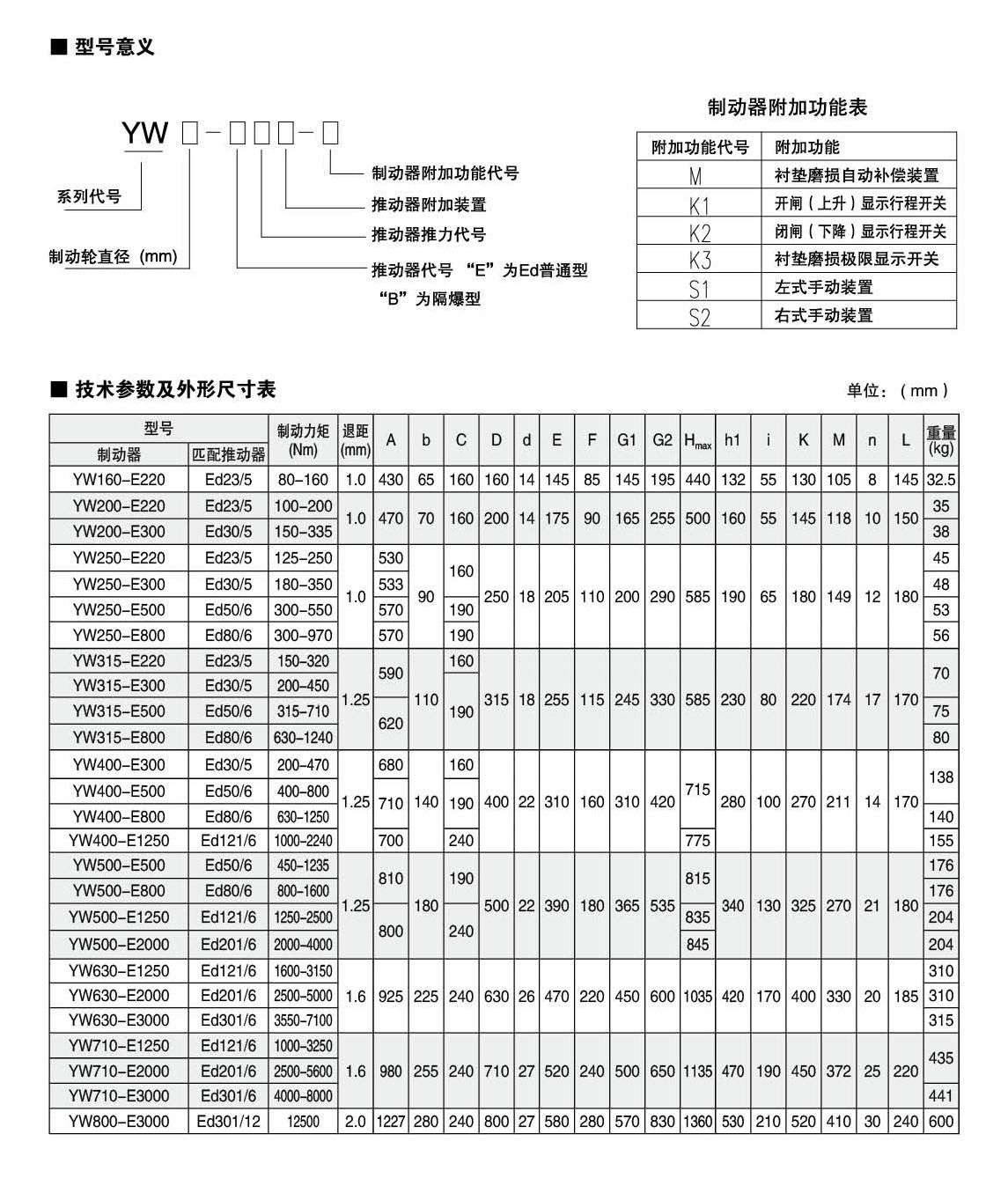 YW,YWZ13系列電力液壓鼓式制動(dòng)器的連接尺寸和技術(shù)要求符合JB / T6406-2006標(biāo)準(zhǔn);制動(dòng)力矩參數(shù)符合DIN15435標(biāo)準(zhǔn),配套符合DIN15430標(biāo)準(zhǔn)的Ed系列推動(dòng)器。