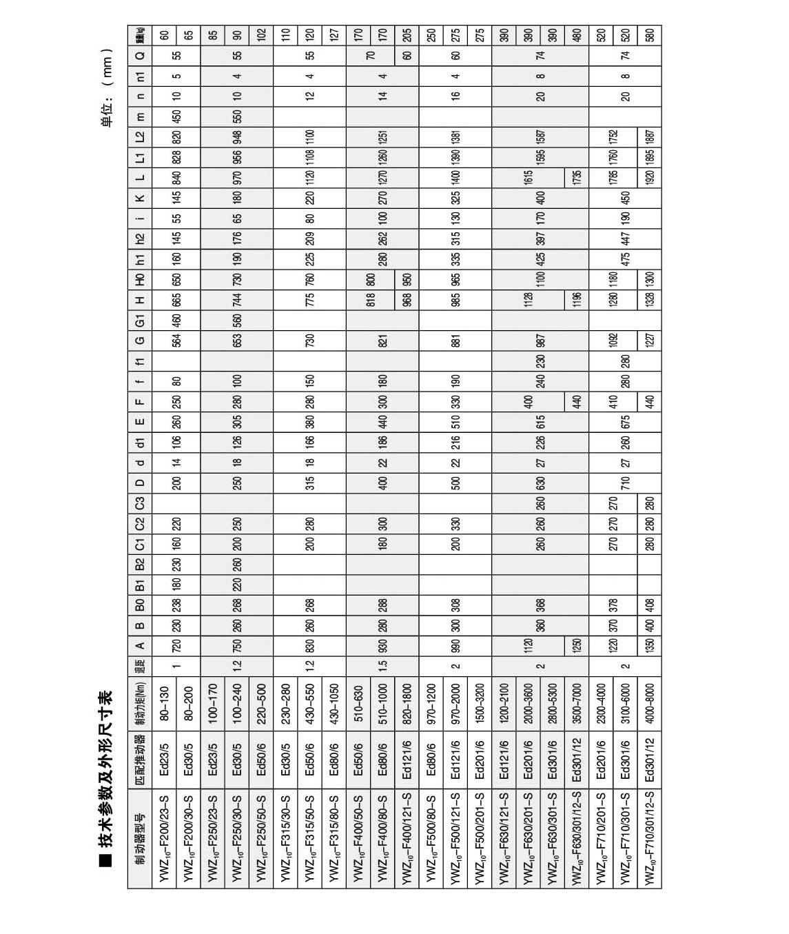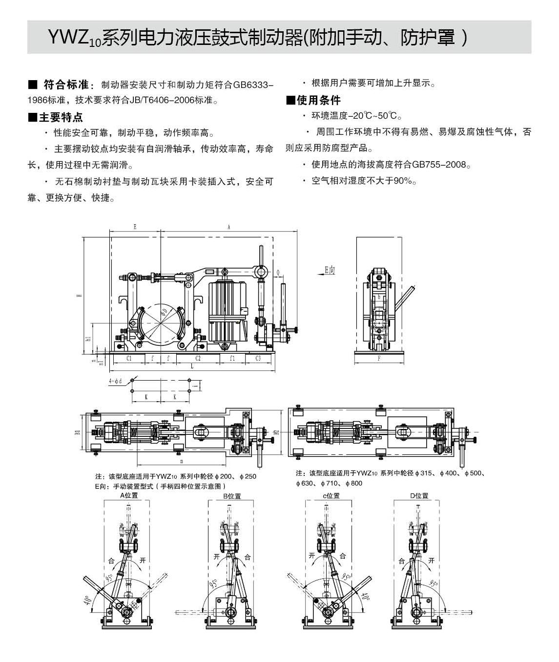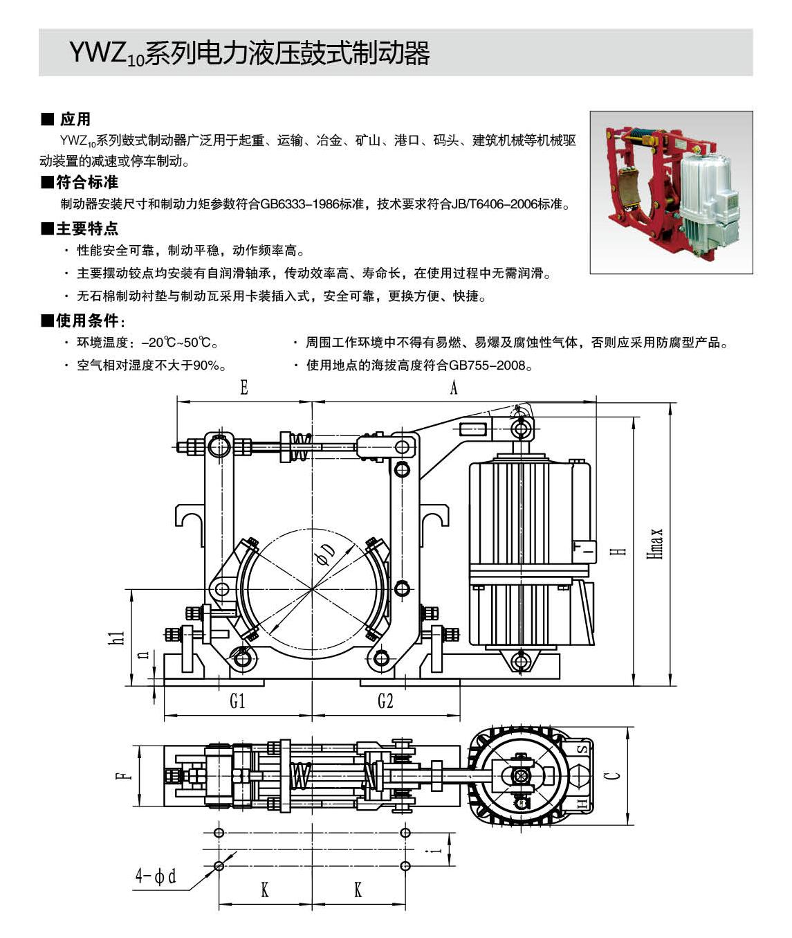 YWZ10,YWZ12系列電力液壓鼓式制動器的連接尺寸和制動力矩參數(shù)符合GB6333-86標準,技術(shù)要求符合JB / T6406-2006標準,配套符合DIN15430標準的Ed系列推動器。